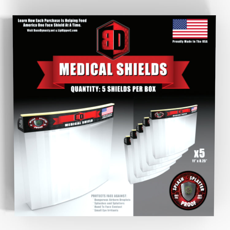 So we've been busy. Making these, Bass Dynasty Med Shields. Protecting against dangerous airborne droplets, splashes and splatters, hand to face contact, and small eye irritants. Yes, our very own Bass Dynasty Face Shields! Cool right?